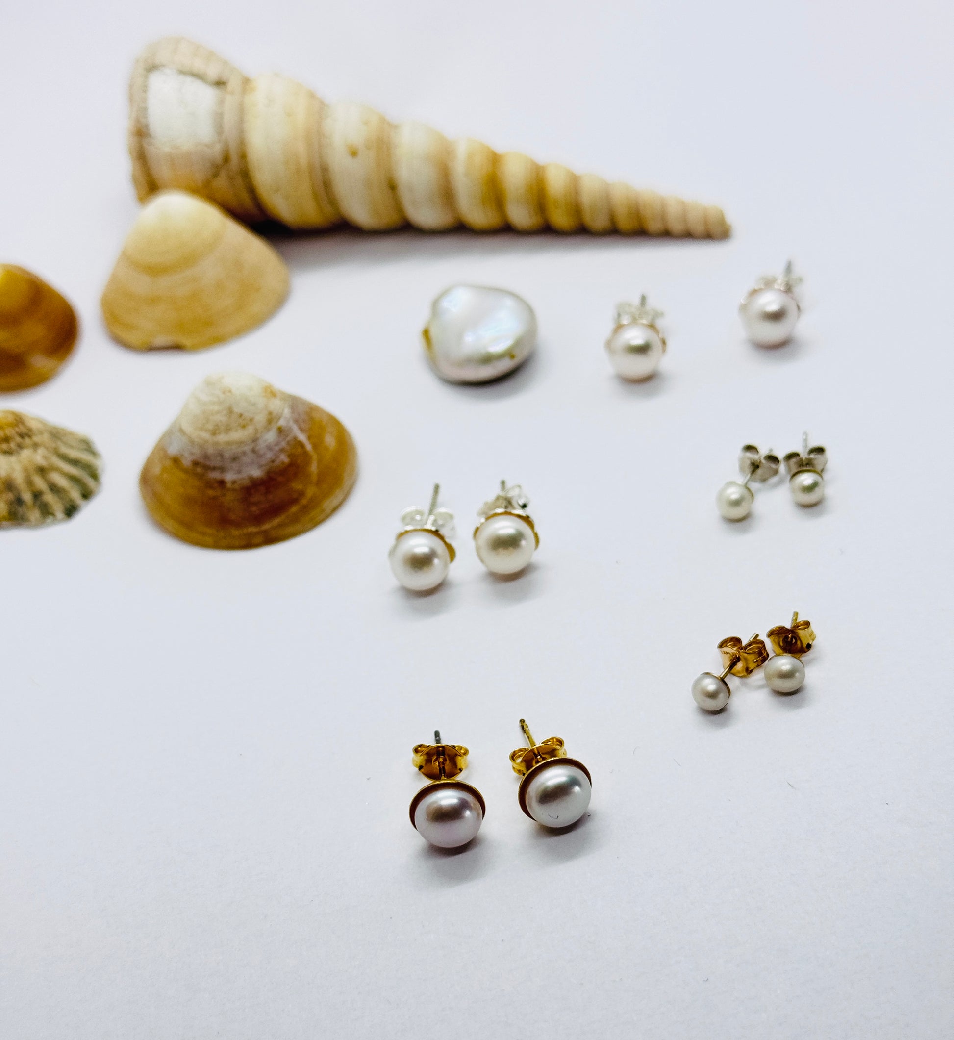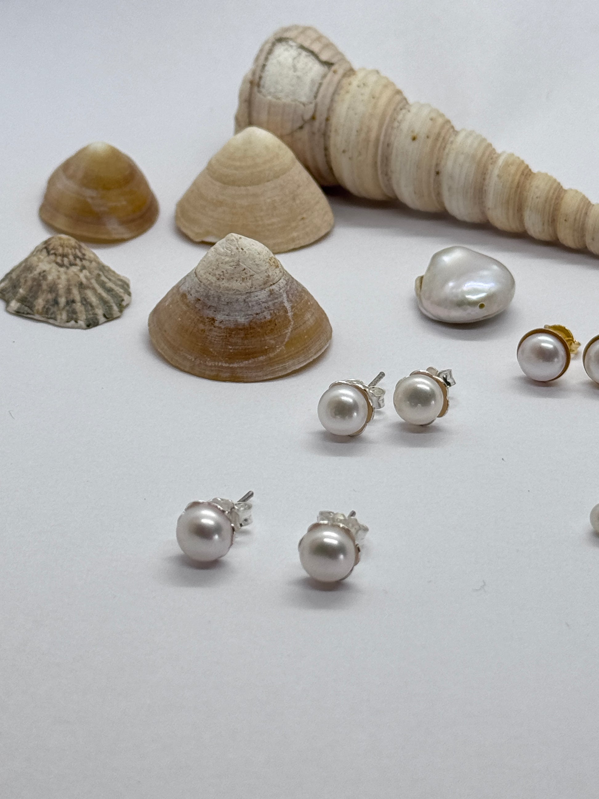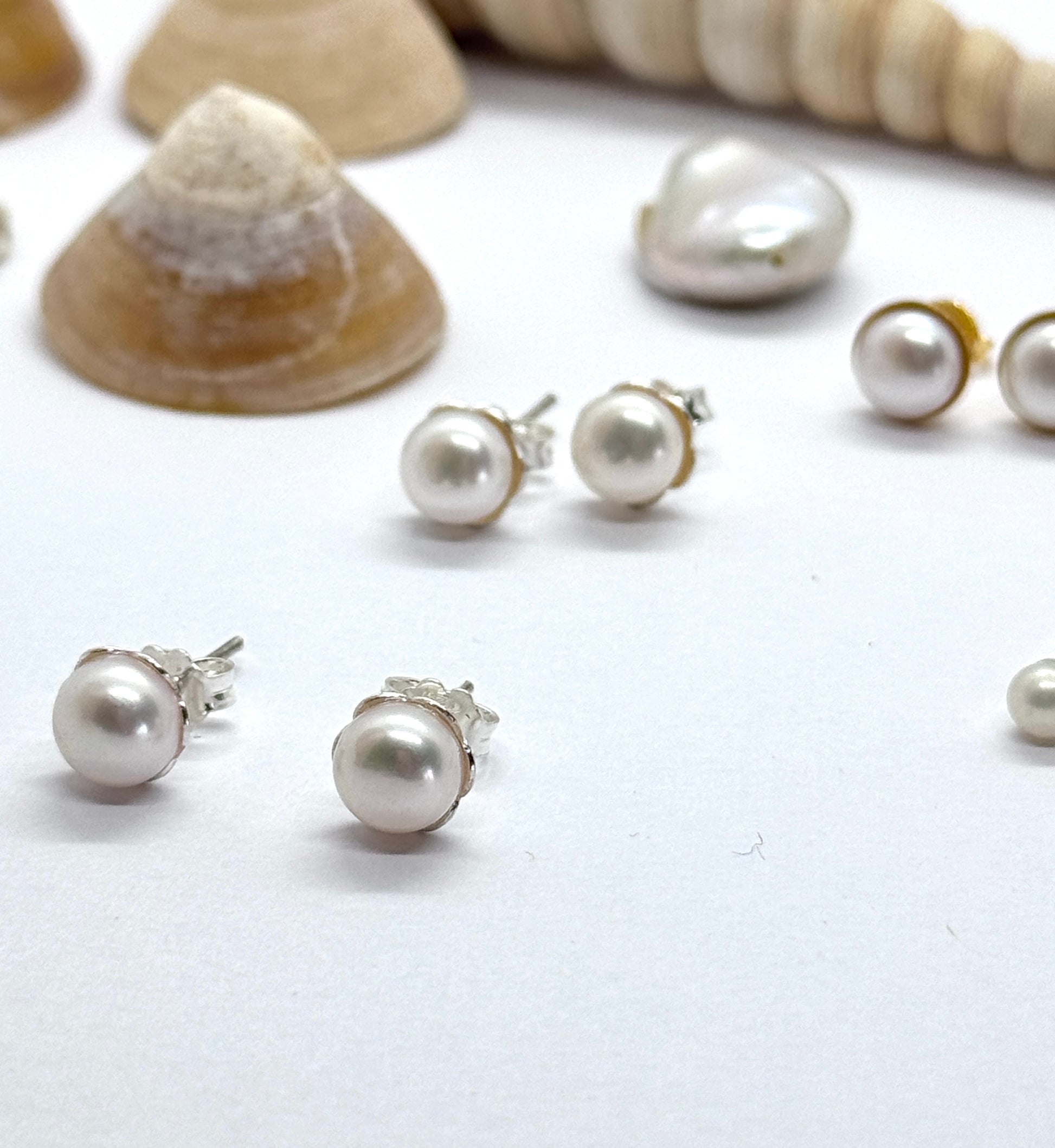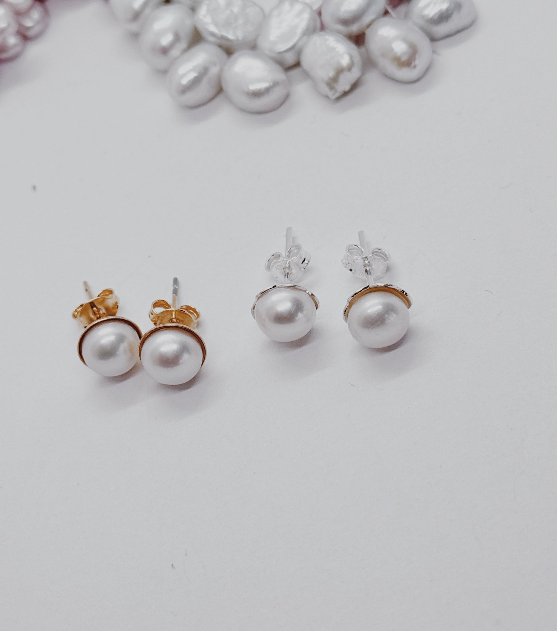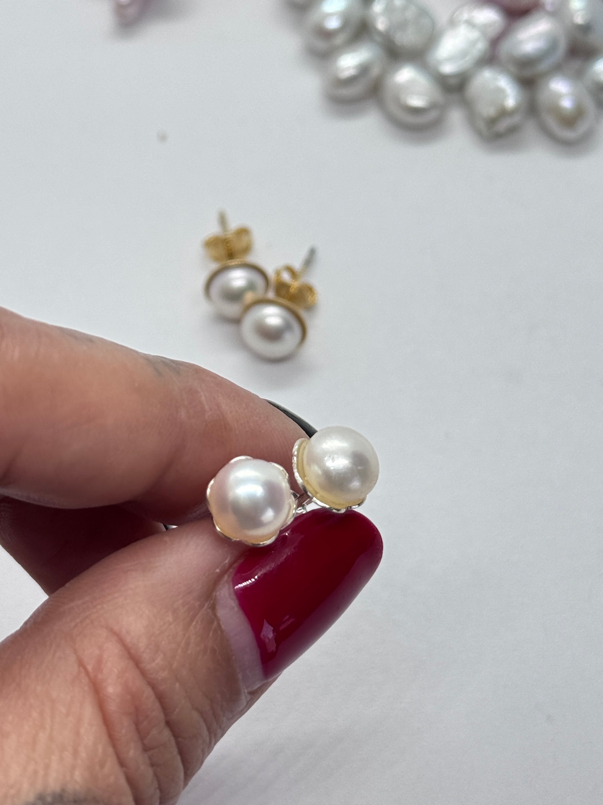 Aritos de perlas de río naturales color blanco, en forma de botón de tamaño 7 mm con pin plata 950 y también en baño de oro 21 K.