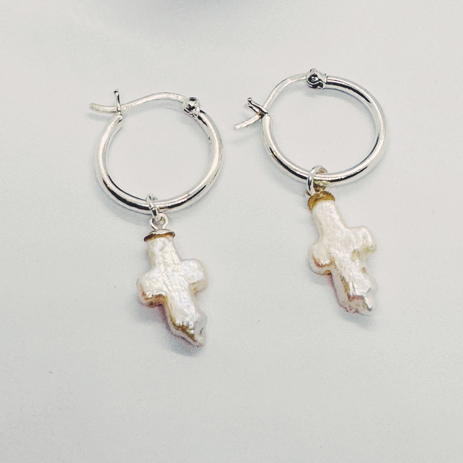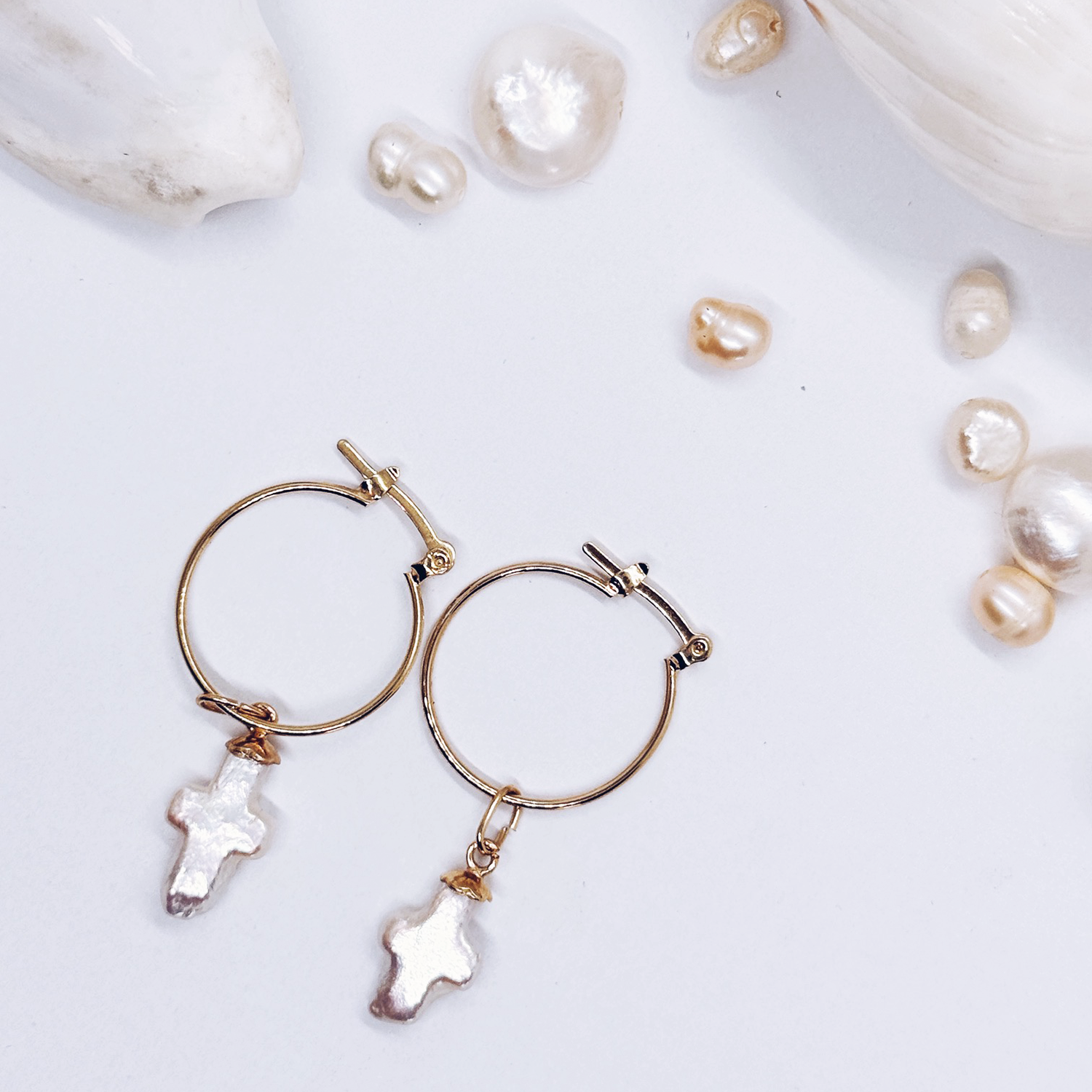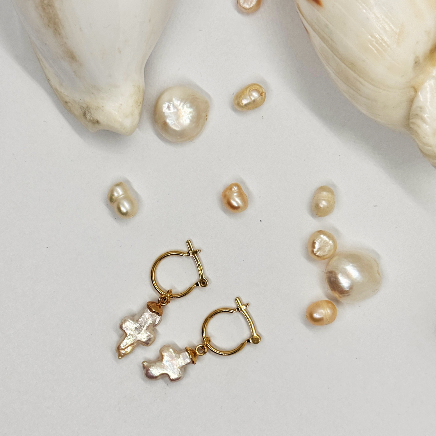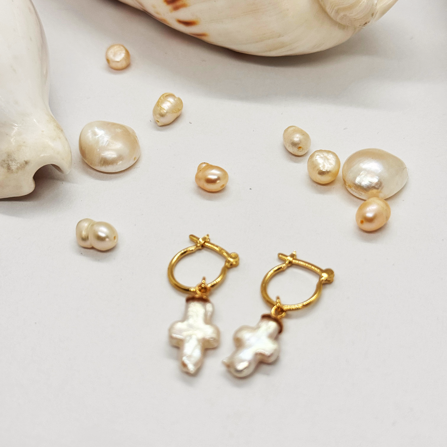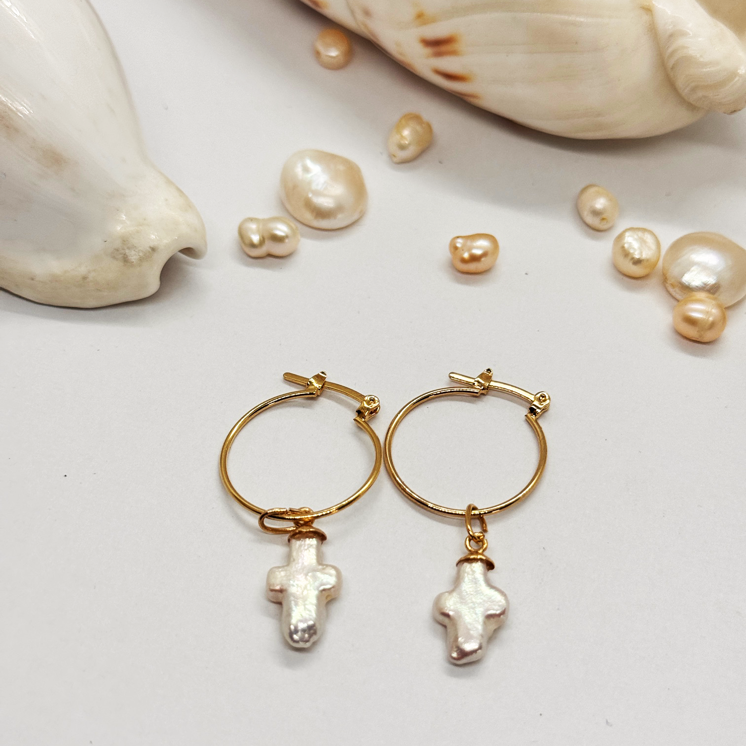 Estos aros combinan elegancia y naturaleza con una argolla de baño en oro de 21k, que aporta un brillo sofisticado y duradero. De cada argolla cuelga con perla de río blanca barroca en forma de cruz, suave y blanca, medidas 11x 8 mm aprox, lo que da un toque de frescura y distinción, evocando la serenidad del agua. Tú elijes tu argolla de 12 mm o 18 mm