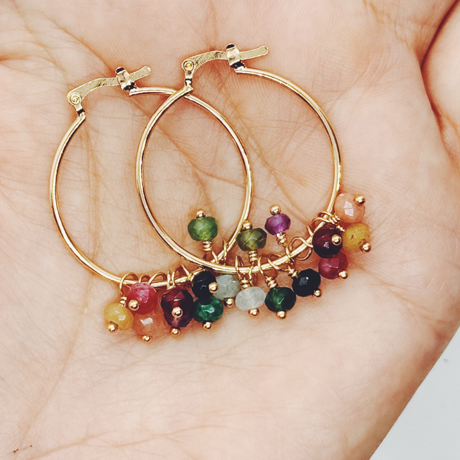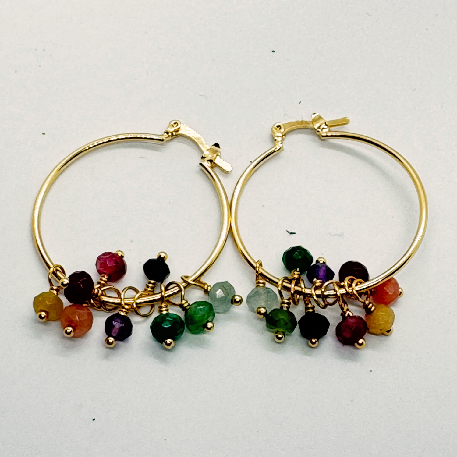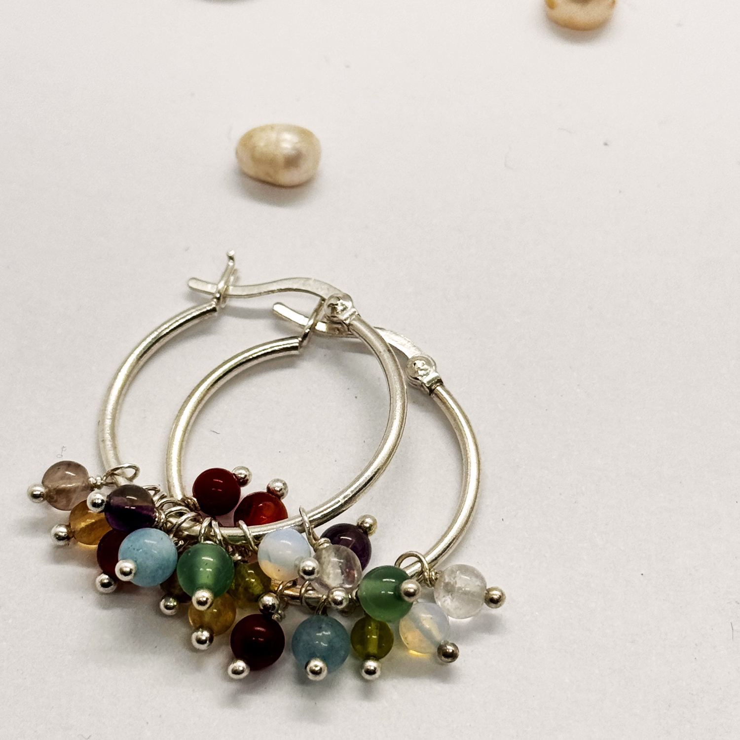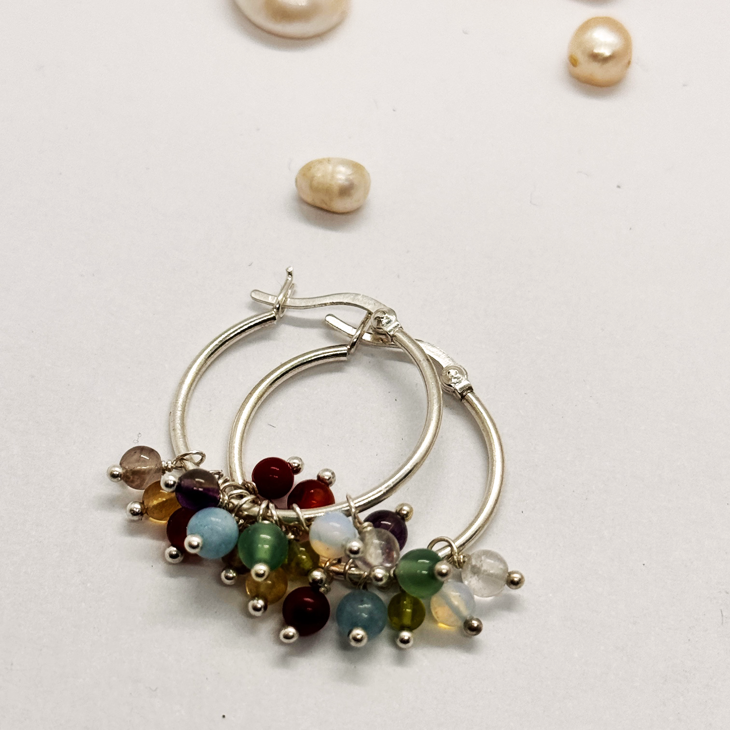 Finos aros que combinan elegancia y naturaleza con una argolla macizas de 26 mm que aporta un brillo plateada y duradero. De cada argolla cuelgan perlitas de río pequeñas de 3mm color blanco combinadas con bellas piedras semipreciosa facetadas. Añade un toque de frescura y distinción, evocando la serenidad del agua y la magia de las piedras naturales.