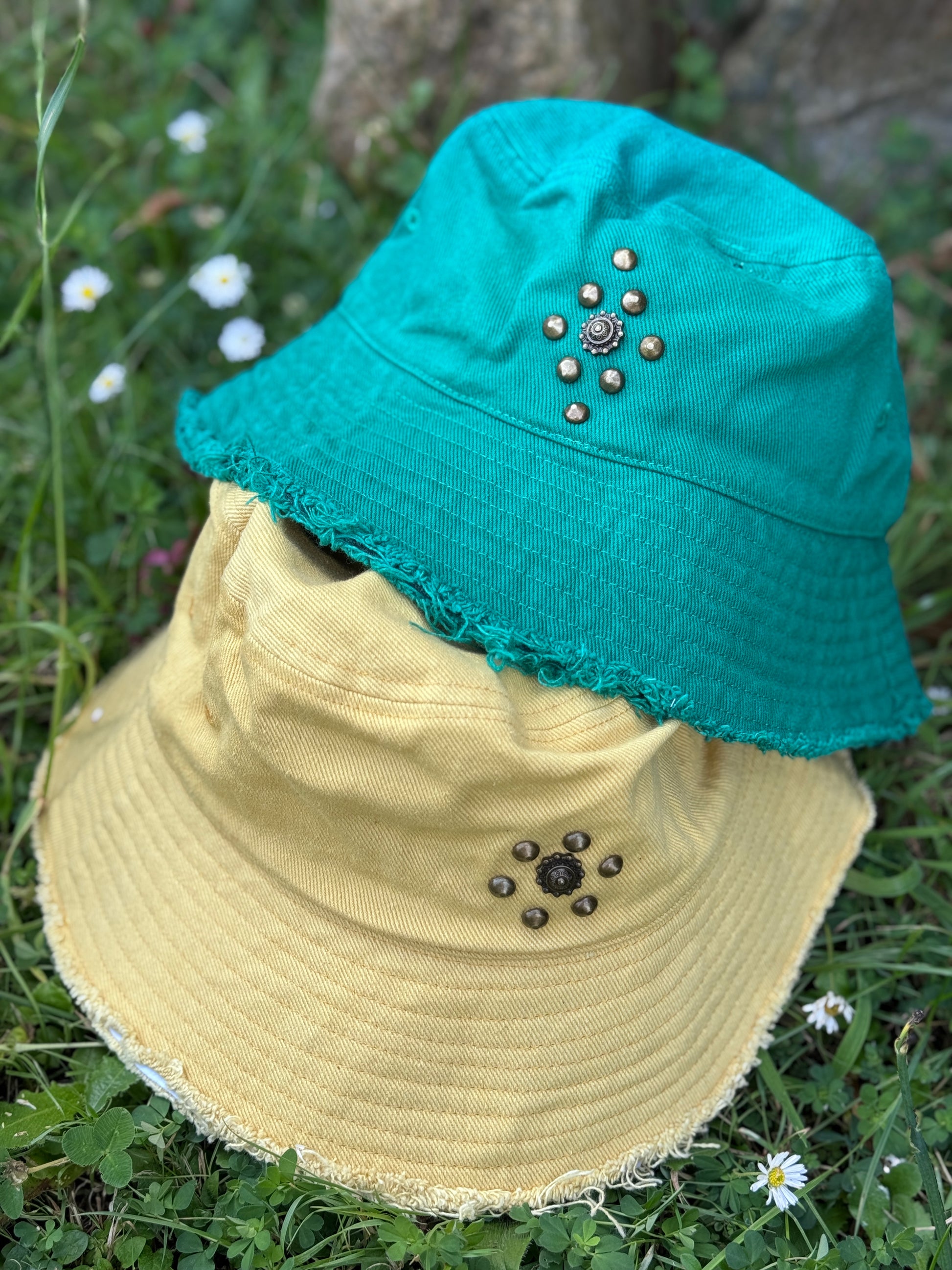 Nuestras bucket de verano son de tela de algodón desgastada con remaches bronce, envejecidos y plateados.
