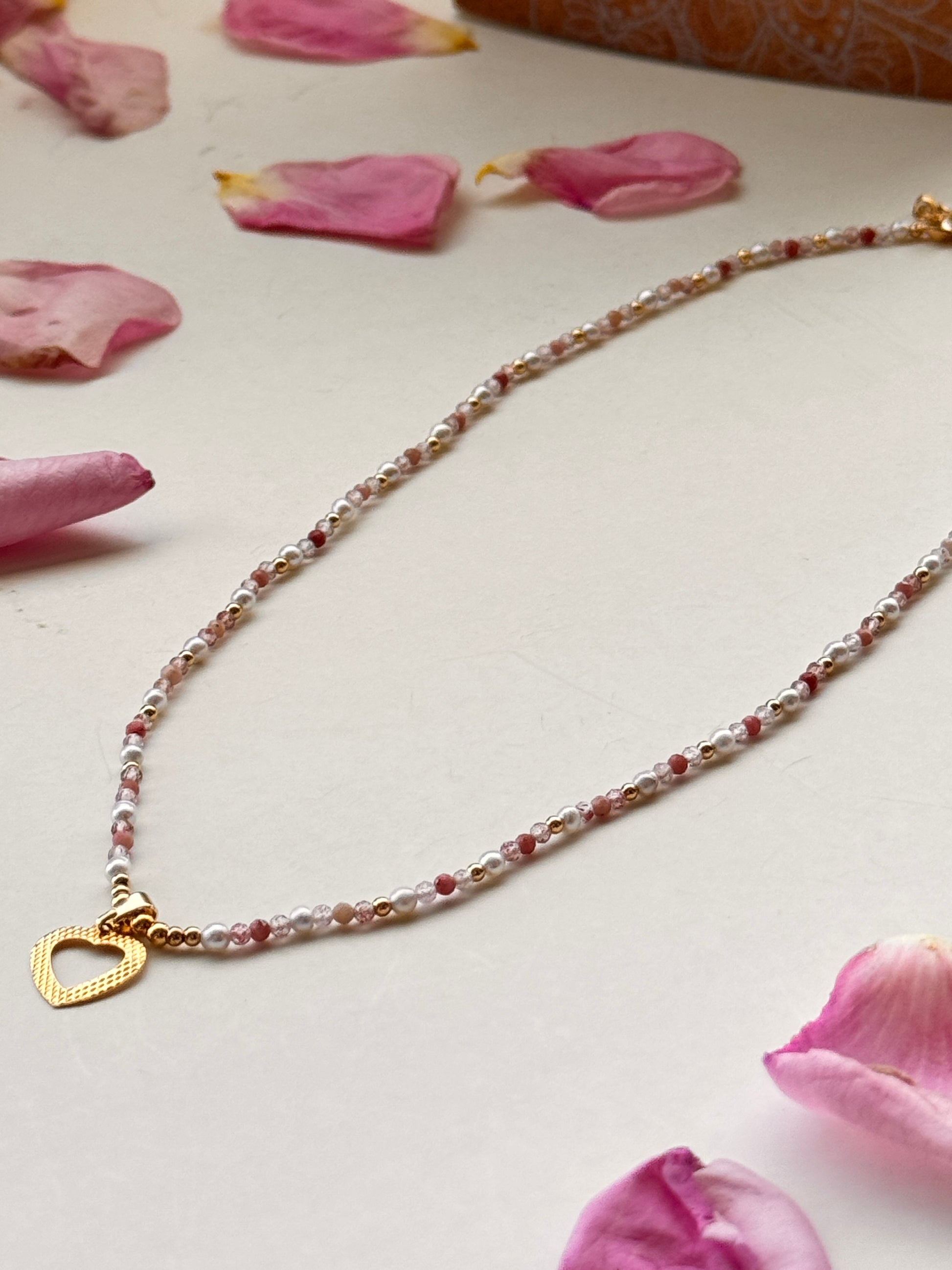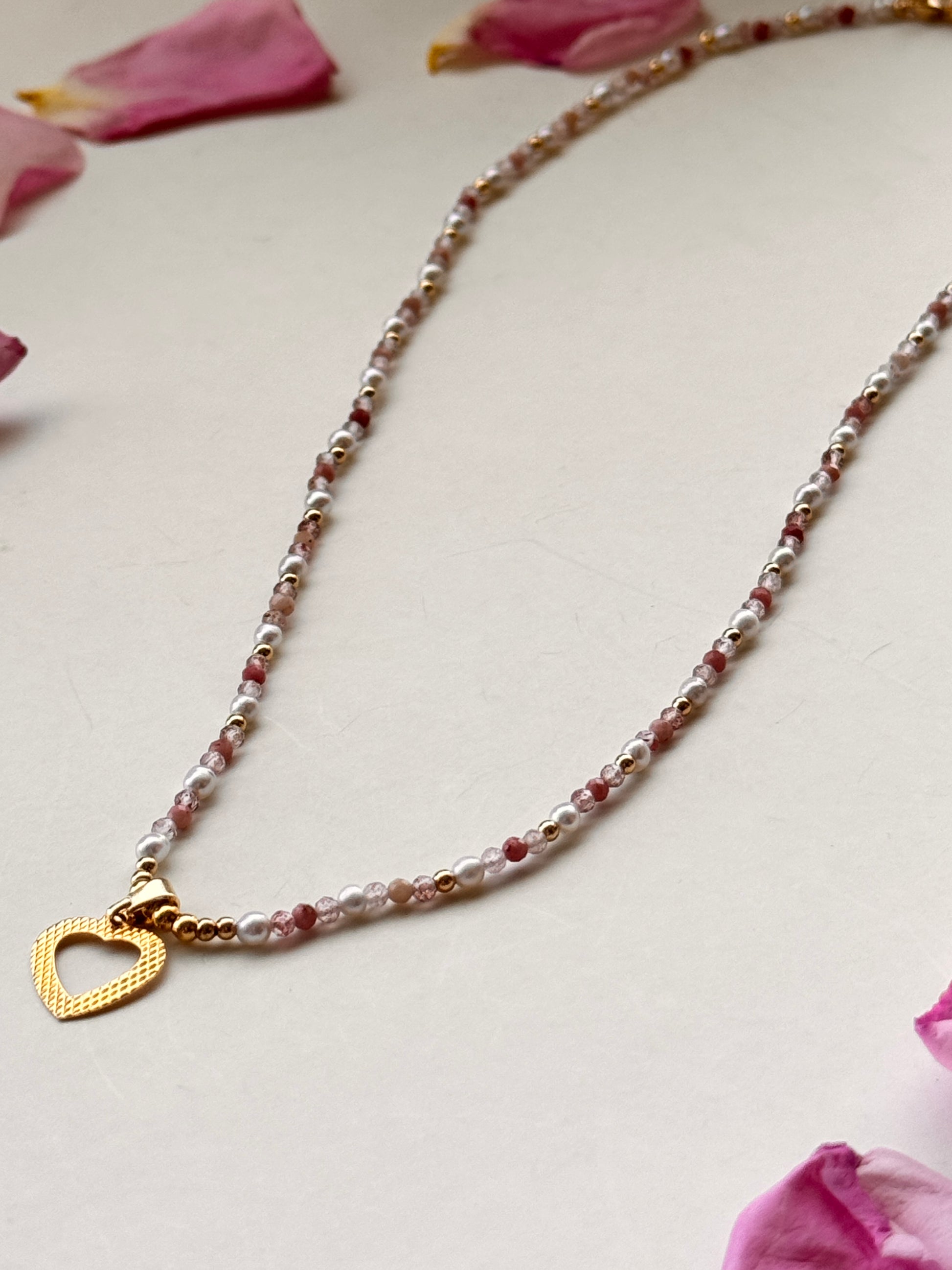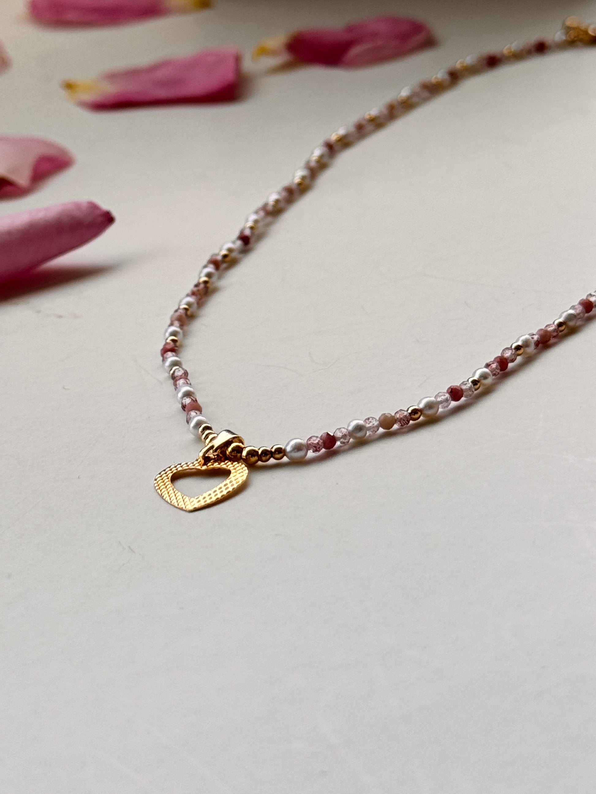 Hermoso collar hilado a mano, creado con dedicación y detalle. Combina mostacillas, mini perlas de río naturales y terminaciones en baño de oro de 21K, junto a una cuidada selección de piedras semipreciosas: cuarzo fresa, turmalina rosa y rodonita. Cada pieza es única y refleja un equilibrio perfecto entre lo artesanal y lo sofisticado.
