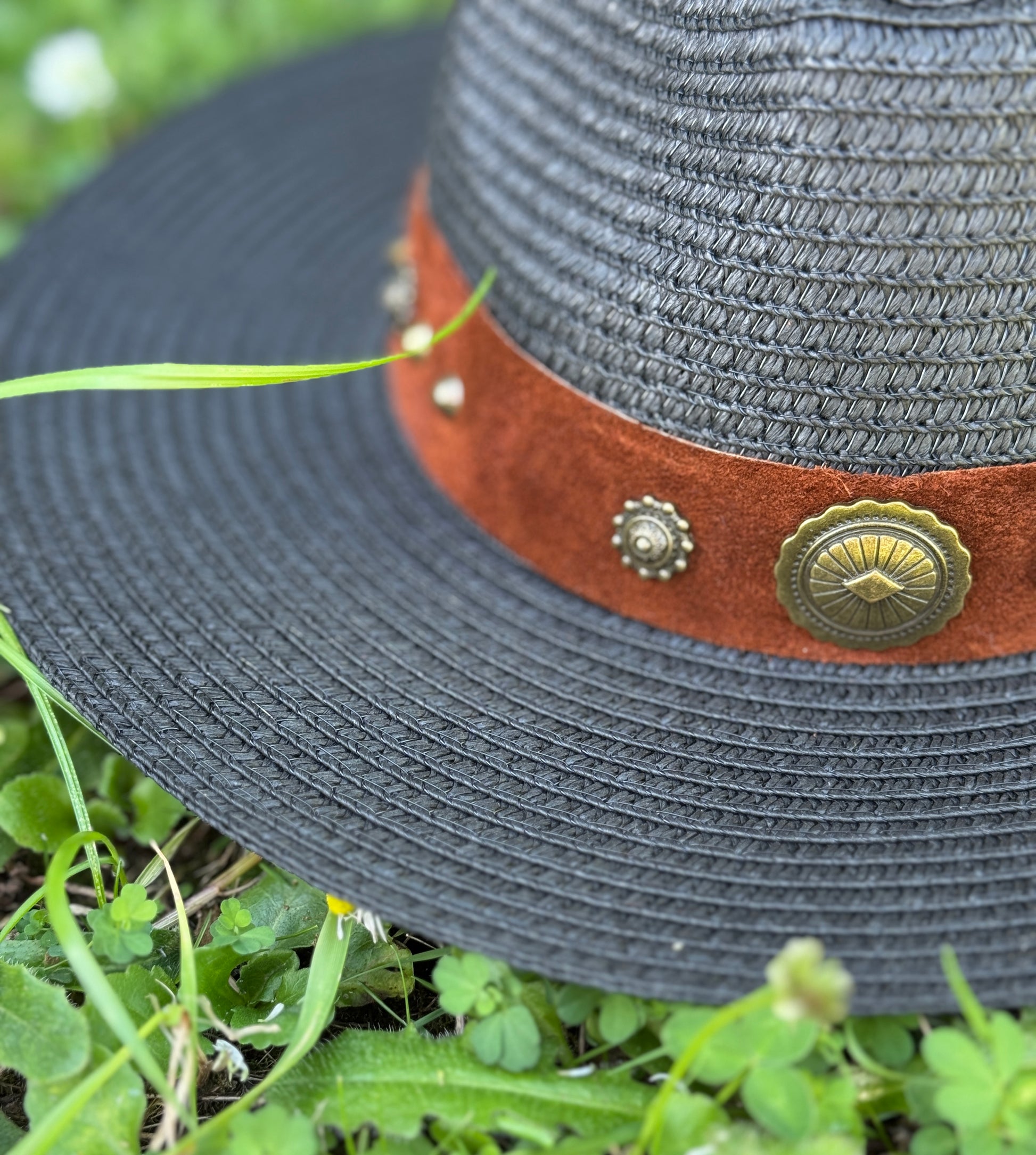 Es un modelo muy versátil ideal para el verano , tiene un ala ondeada con un cinto cuero natural color café caramelo con bellos remaches bronce envejecido.
