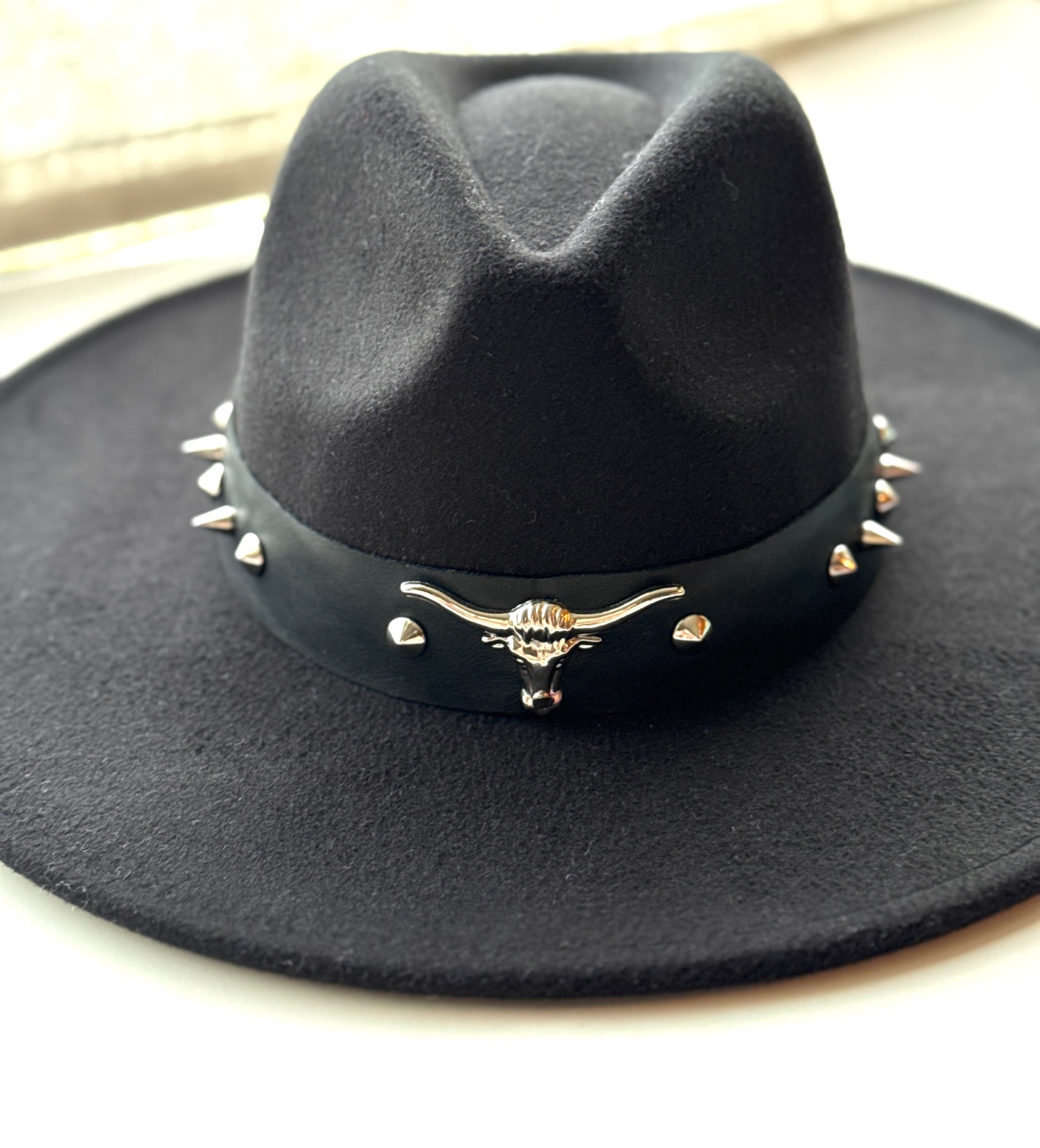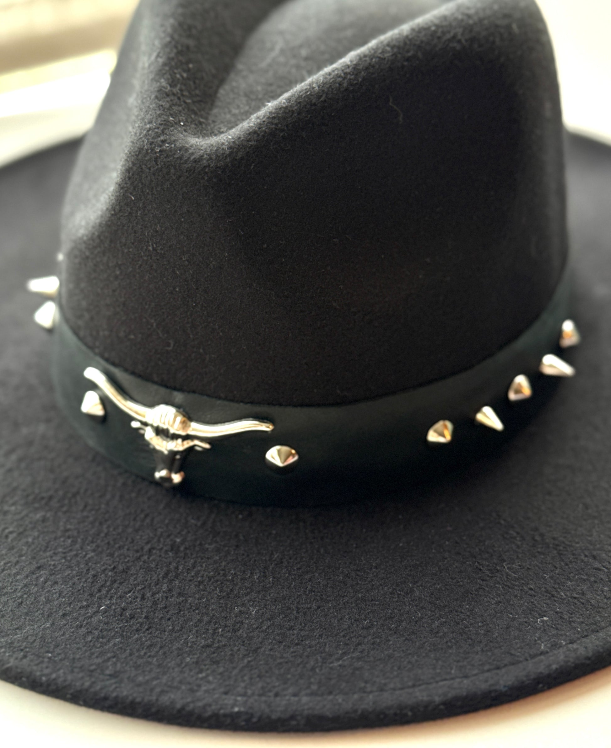Este modelo es de ala larga, elegante y sofisticado. Es color negro, tiene cinto de cuero natural negro, intervenido a mano con remaches en plata envejecida.