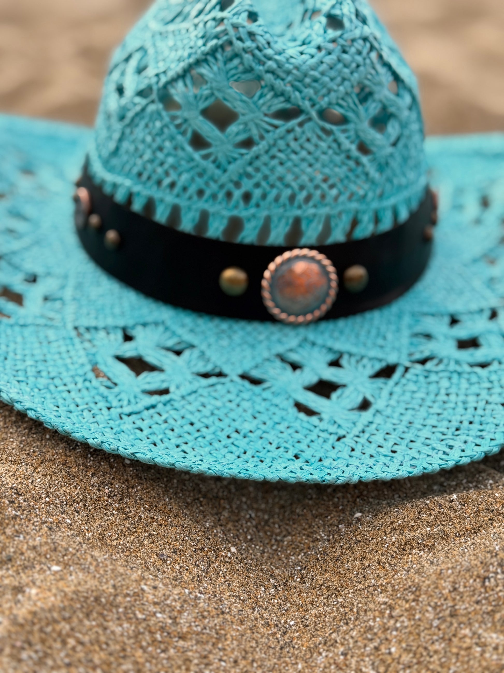 Este hermoso sombrero es color calipso, es calado y el ala es cowgirl.
