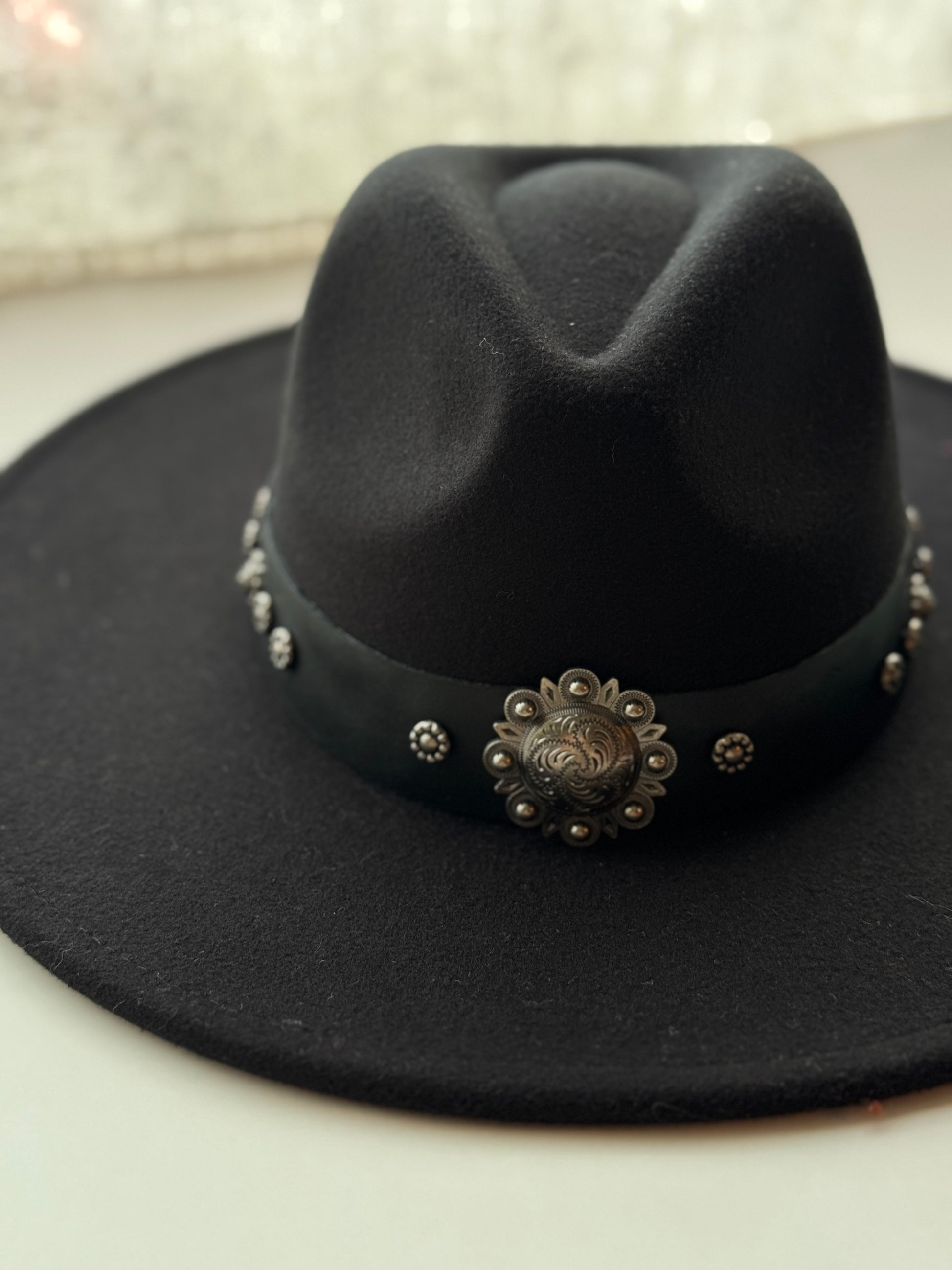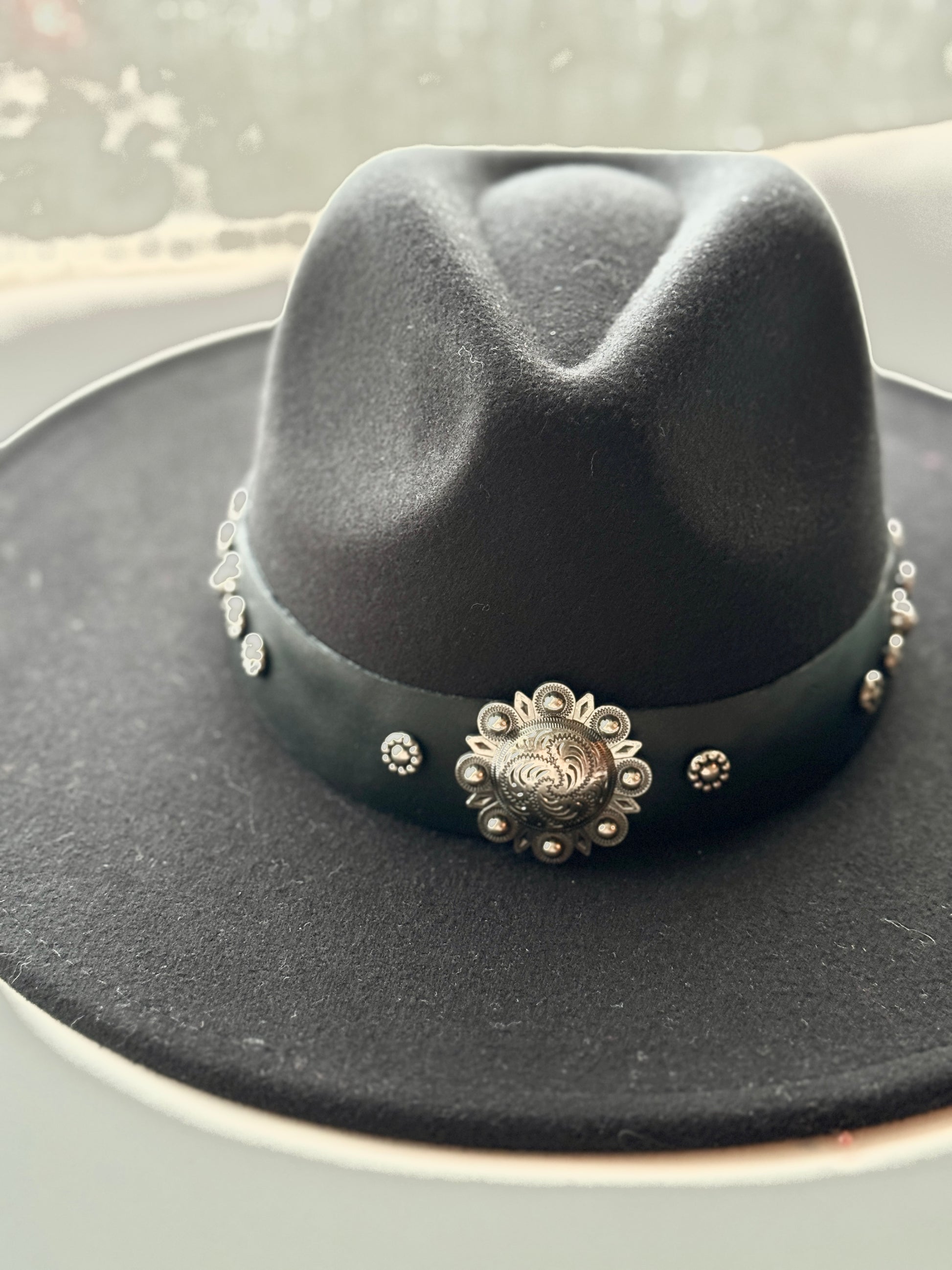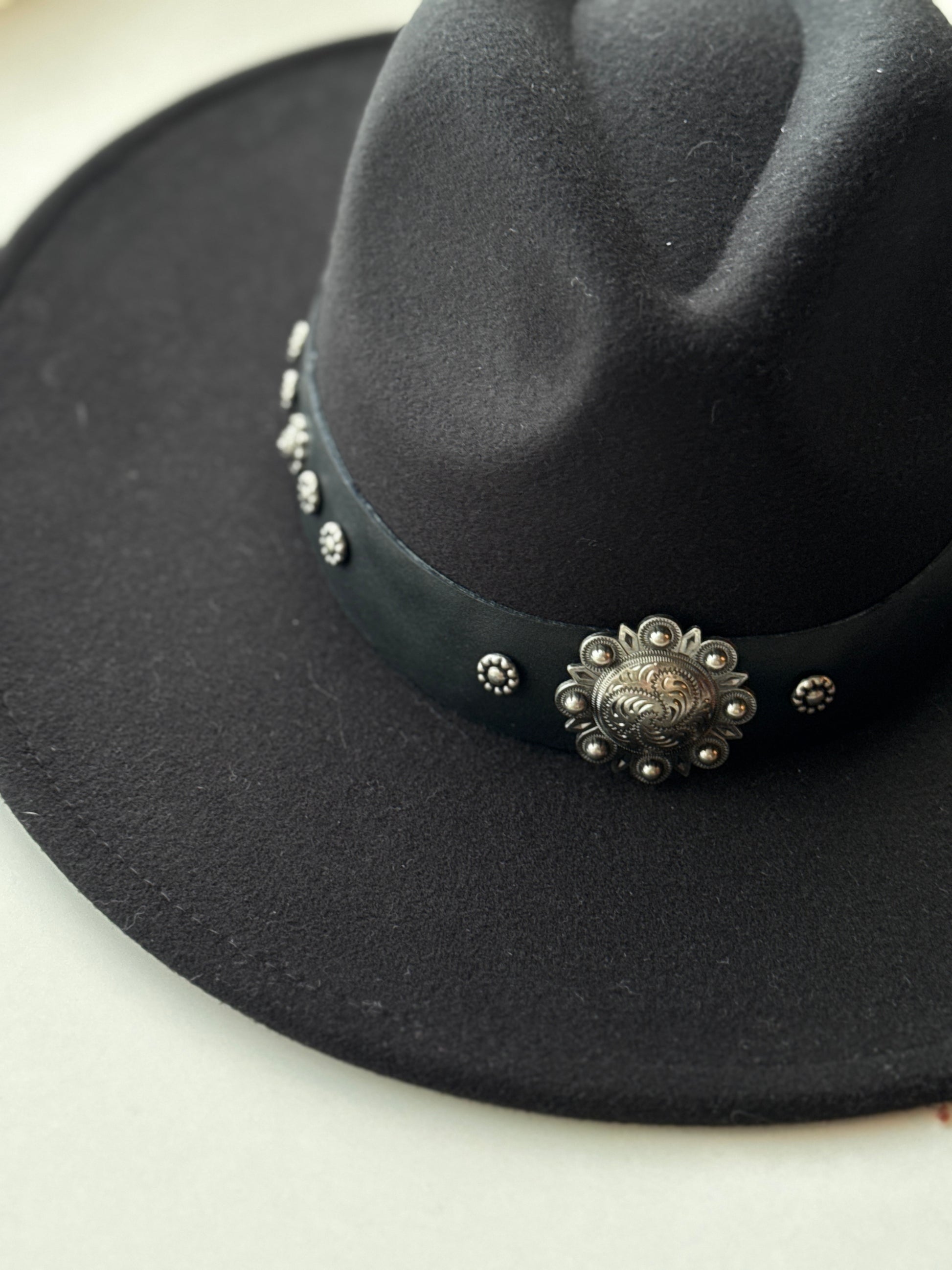 Este modelo es de ala larga, elegante y sofisticado. Color negro, tiene cinto de cuero negro, intervenido a mano con remaches en plata envejecida.