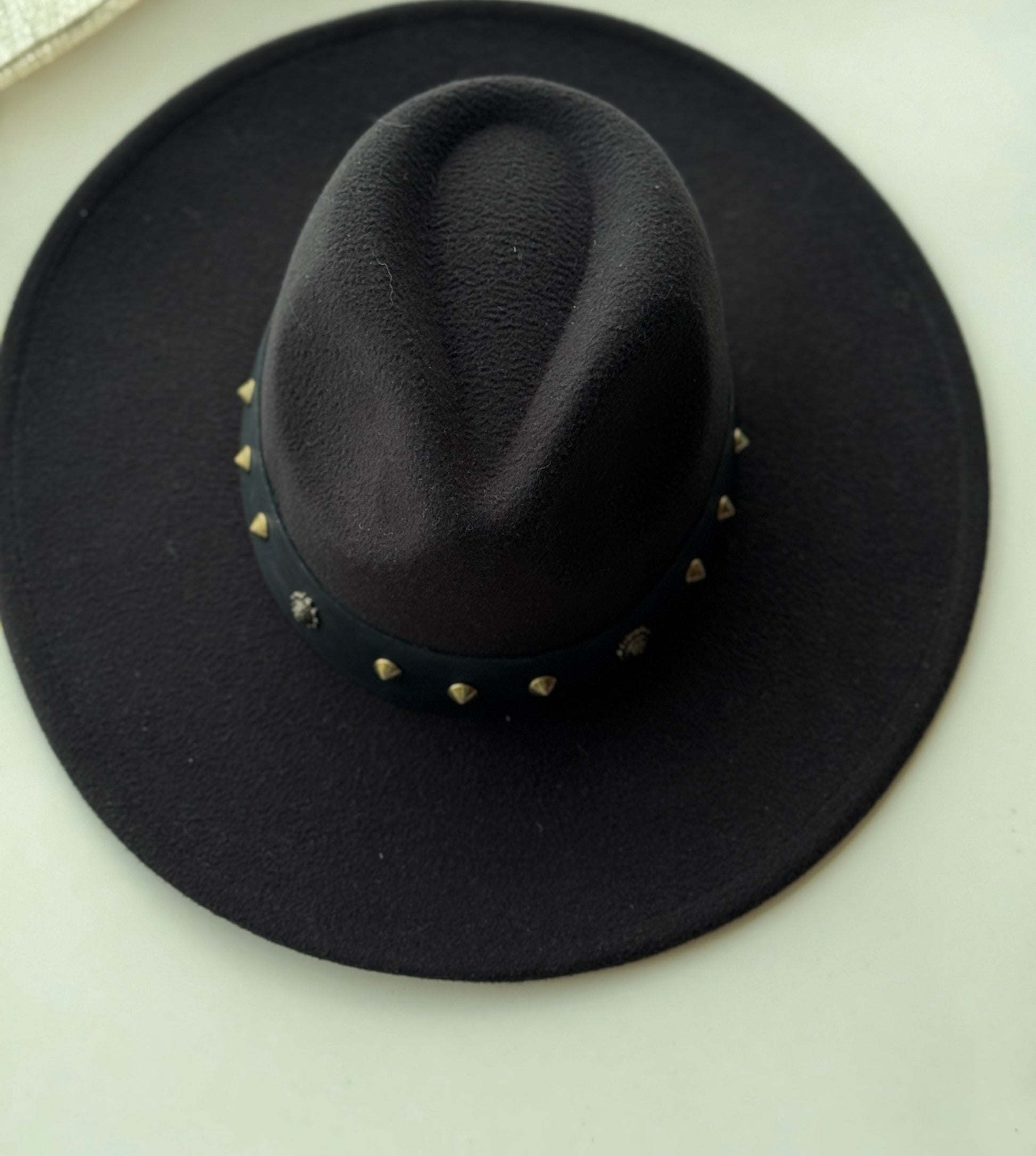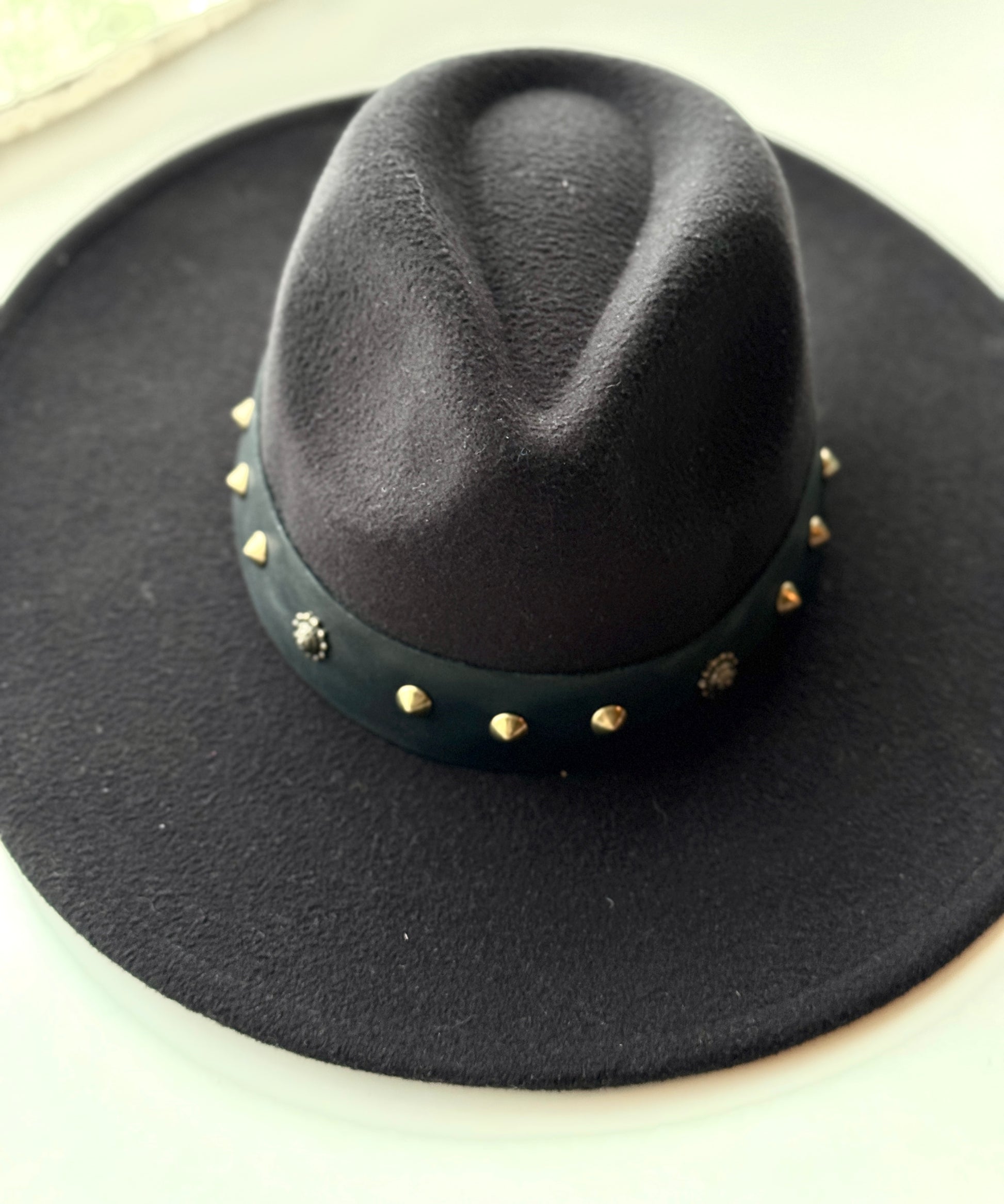 Este modelo es de ala larga, elegante y sofisticado. Es de color negro, tiene cinto de cuero natural negro intervenido a mano con remaches de punta color bronce.