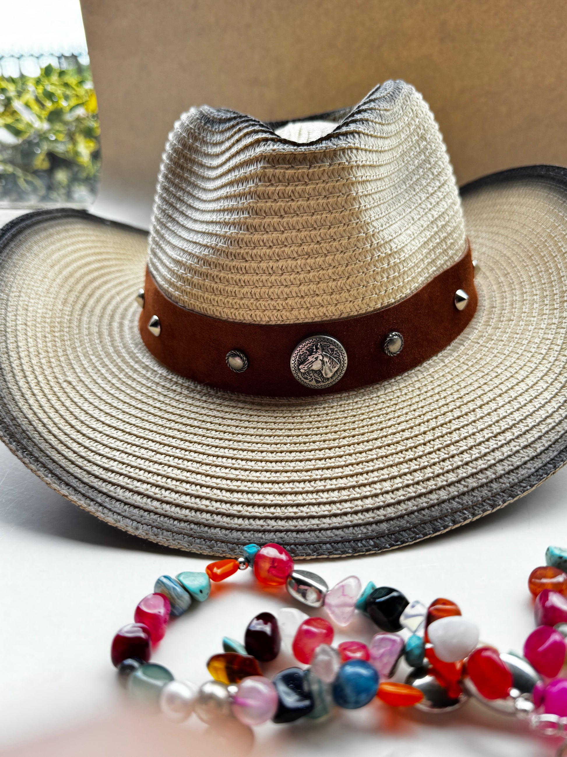 Este hermoso sombrero tiene un efecto degradé en tonos cremas con grises y su es ala cow pero puedes adaptarla como te guste.