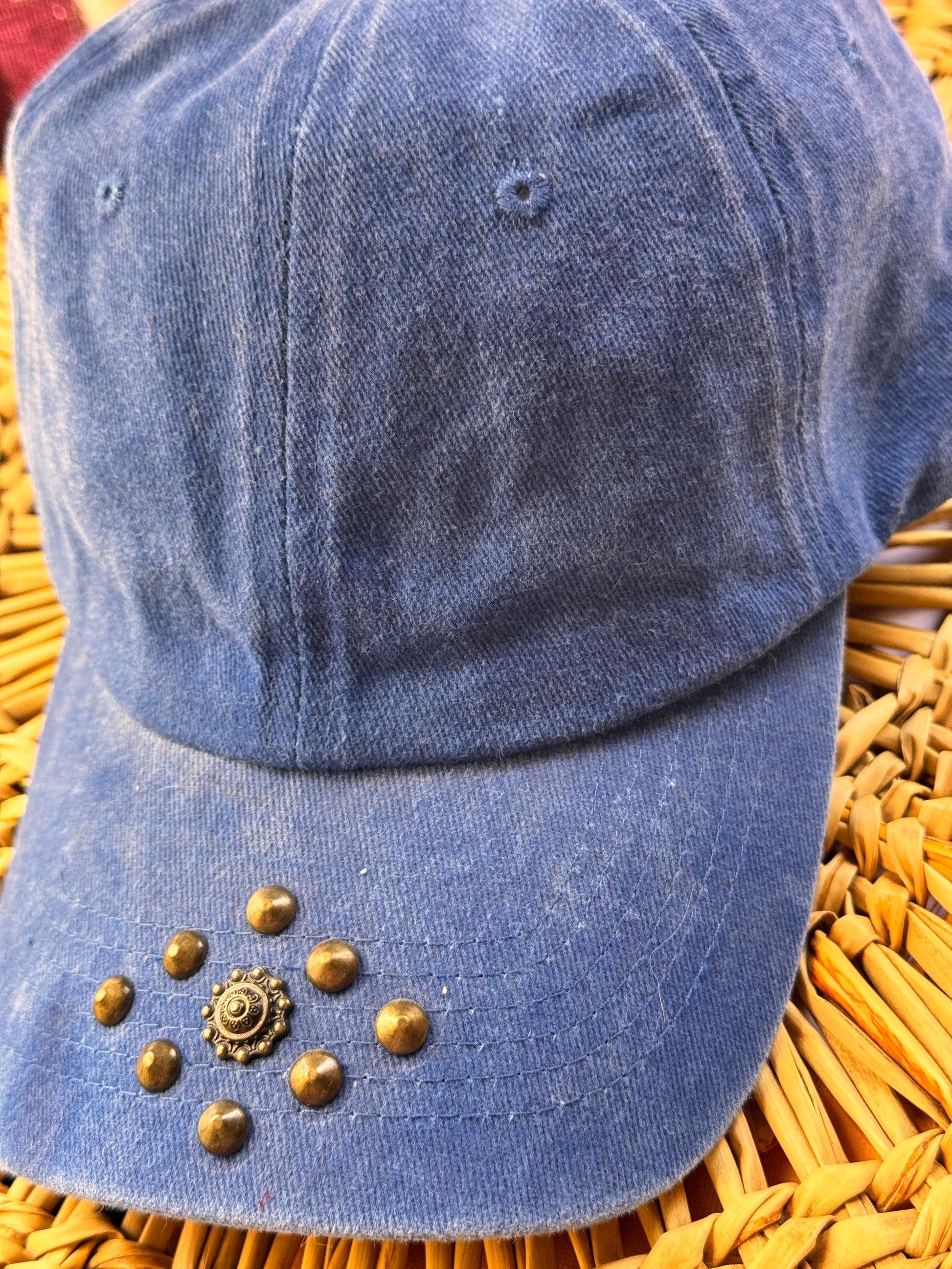 Gorra Metri es color azul, cian, efecto desgastada con remaches bronce, envejecidos y plateados.